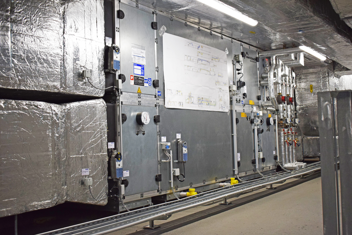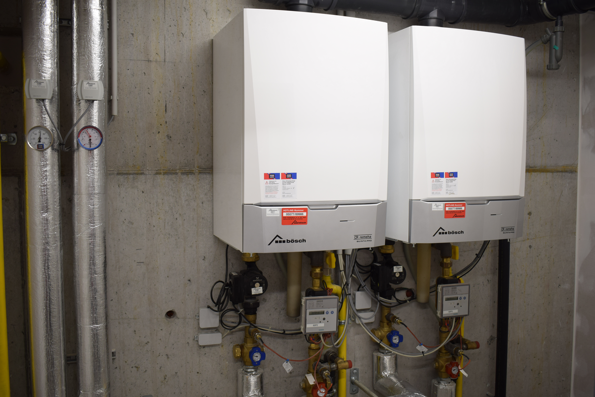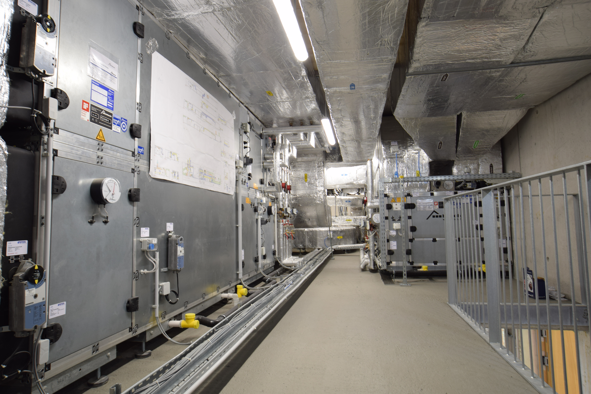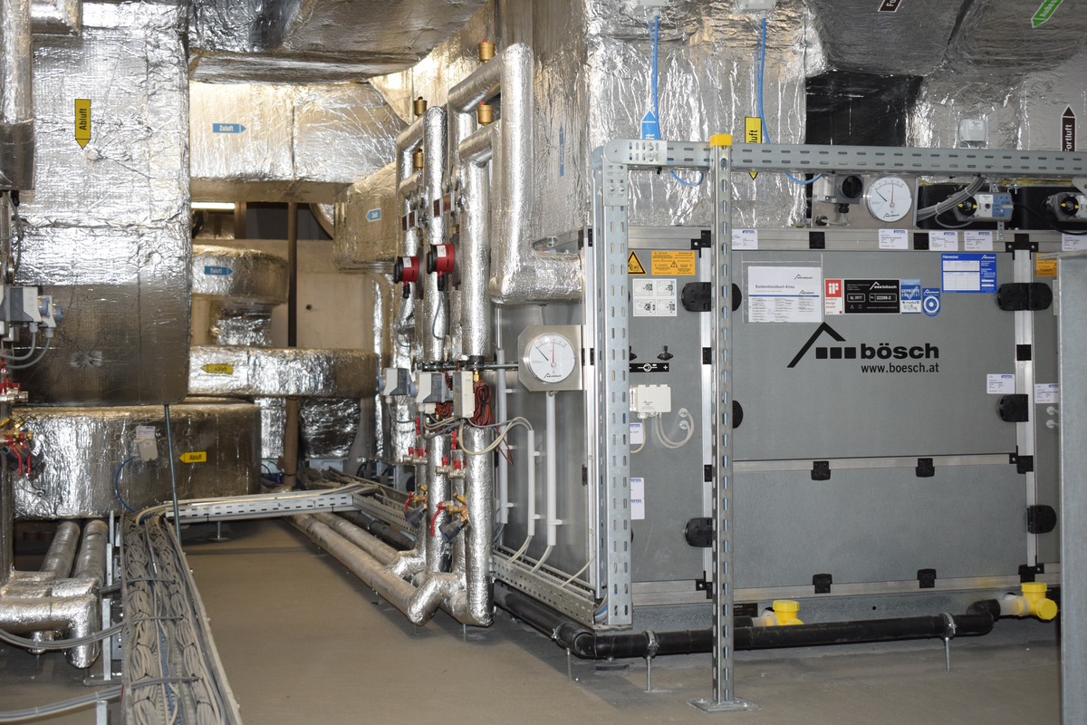 Die Abdeckung der Spitzenlasten erfolgt mit Erdgas. Die beiden Gas-Brennwert-Heizzentralen werden als Kaskade betrieben. Diese dienen zur Spitzenlastabdeckung und als Ausfallsicherung. Bei Ausfall der Wärmepumpe wird, bis die Wärmepumpe wieder störungsfrei ist, automatisch auf den Gaskessel umgeschaltet. Die zentrale Lüftungsanlage mit insgesamt fünf verschiedenen Zu-/Abluftgeräten mit Wärmerückgewinnung erfüllt im Zusammenspiel mit allen anderen Geräten die hohen Ansprüche der Gemeinde Lustenau als e5-Gemeinde.
