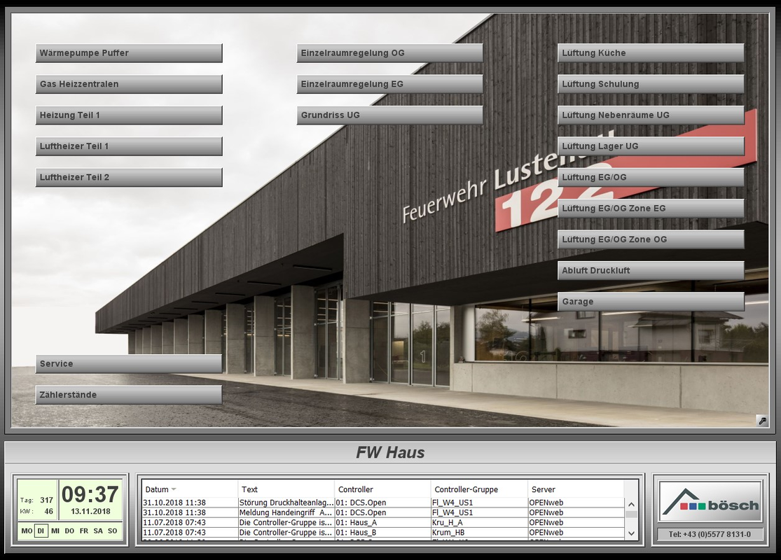 Mit der Regelung DEOS von bösch hat die Feuerwehr Lustenau auch in ihrem Feuerwehrhaus alles unter Kontrolle. Die Regelung umfasst die Heizung- und Lüftungsanlagen samt Einzelraumregelung. Auch die CO2-Überwachung der Fahrzeughalle und die Ansteuerung der Belüftungstechnik sind in der Regelung inkludiert. All dies gewährleistet einen effizienten Betrieb der gesamten Anlage und das perfekte Zusammenspiel der bösch Geräte.