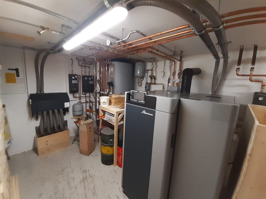 Die neue Biomasseanlage übernimmt die gesamte Gebäudeheizung und Warmwasserversorgung für das 4-Parteien-Haus. Unterstützung kommt von den zwei bestehenden Solaranlagen. Über sie wird bei Sonnenschein das Brauchwasser und der Puffer erwärmt. Beide Anlagen in das neue System einzubinden erforderte etwas Scharfsinn und Fingerspitzengefühl, wurde vom bösch Kundendienst aber, wie gewohnt, gut gemeistert. Und so bringt auch die Sonne ihren wertvollen Beitrag zu einem sparsamen Betrieb der neuen Heizungsanlage.