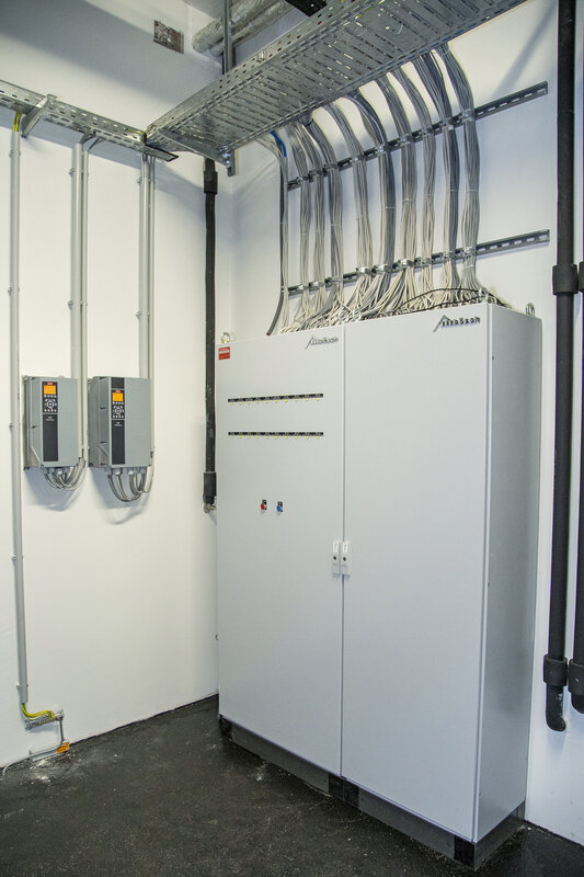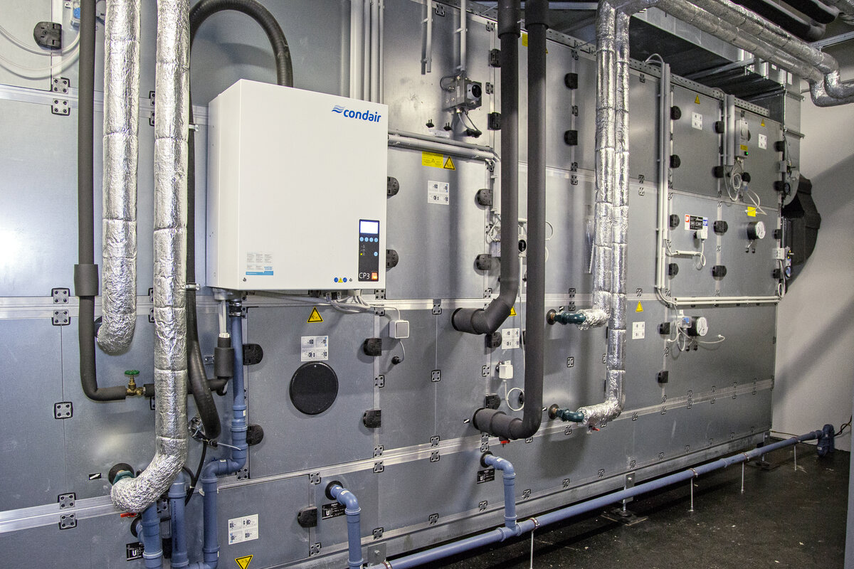 Ein Lüftungsgerät in modul a-Bauweise mit integriertem ZUL-Kanal, eine Wärmepumpe zum Heizen und Kühlen sowie die Regelungstechnik (MSR) von der Walter Bösch GmbH & Co KG sorgen für höchsten Komfort an den Arbeitsplätzen. Das Lüftungsgerät wälzt eine Luftmenge von 6.500 m³ pro Stunde um und besitzt eine Wärmerückgewinnung mit Sorptionsrotor (RWZ 63 %, RFZ 63 %). Für ein ideales Klima sorgt die Wärmepumpe von bösch mit einer Heizleistung von 80 kW und einer Kälteleistung von 60 kW. Das Heiz- bzw. Nachheizregister wurde auf 50/40° C ausgelegt. Um die Effizienz der Wärmepumpe zusätzlich zu erhöhen, wird die Verdampfereintrittstemperatur mit der Abwärme des Serverraums erhöht. Die Effizienz der Anlage wird permanent mittels Trendaufzeichnungen bzw. Energiezähler überwacht. Diese werden regelmäßig ausgewertet und dienen als Grundlage für eine fortlaufende Optimierung der Effizienz der Anlage.
