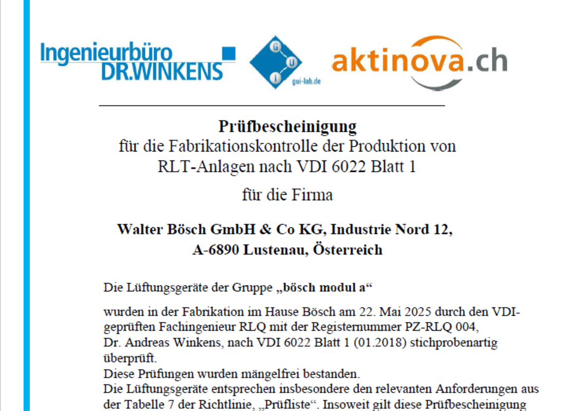 Als einziger Hersteller werden bei bösch nicht nur die Geräte gemäß VDI 6022 geplant und gebaut. Unsere Mitarbeiter nehmen auch regelmäßig an den in der Richtlinie defnierten Schulungen teil und sind dementsprechend A-zertifiziert.