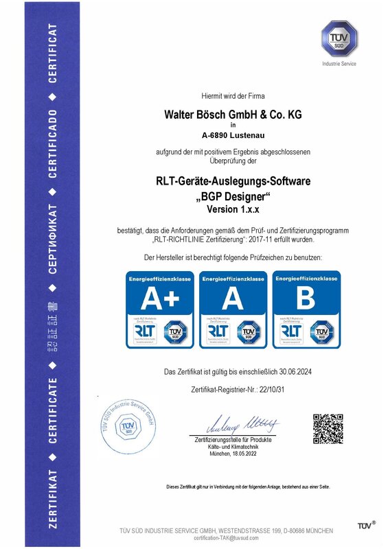 Unsere raumlufttechnischen Geräte werden allesamt über die gemäß RLT-Richtlinie zertifizierte Auslegungs-Software "BGP Designer" konzipiert. Damit erfüllen unsere Geräte erhöhte Anforderungen. Das Energieeffizienz-Label vom RLT-Herstellerverband und TÜV SÜD steht für eindeutige und nachvollziehbare Aussagen zur Energieeffizienz, der mit ihm gekennzeichneten RLT-Geräte.